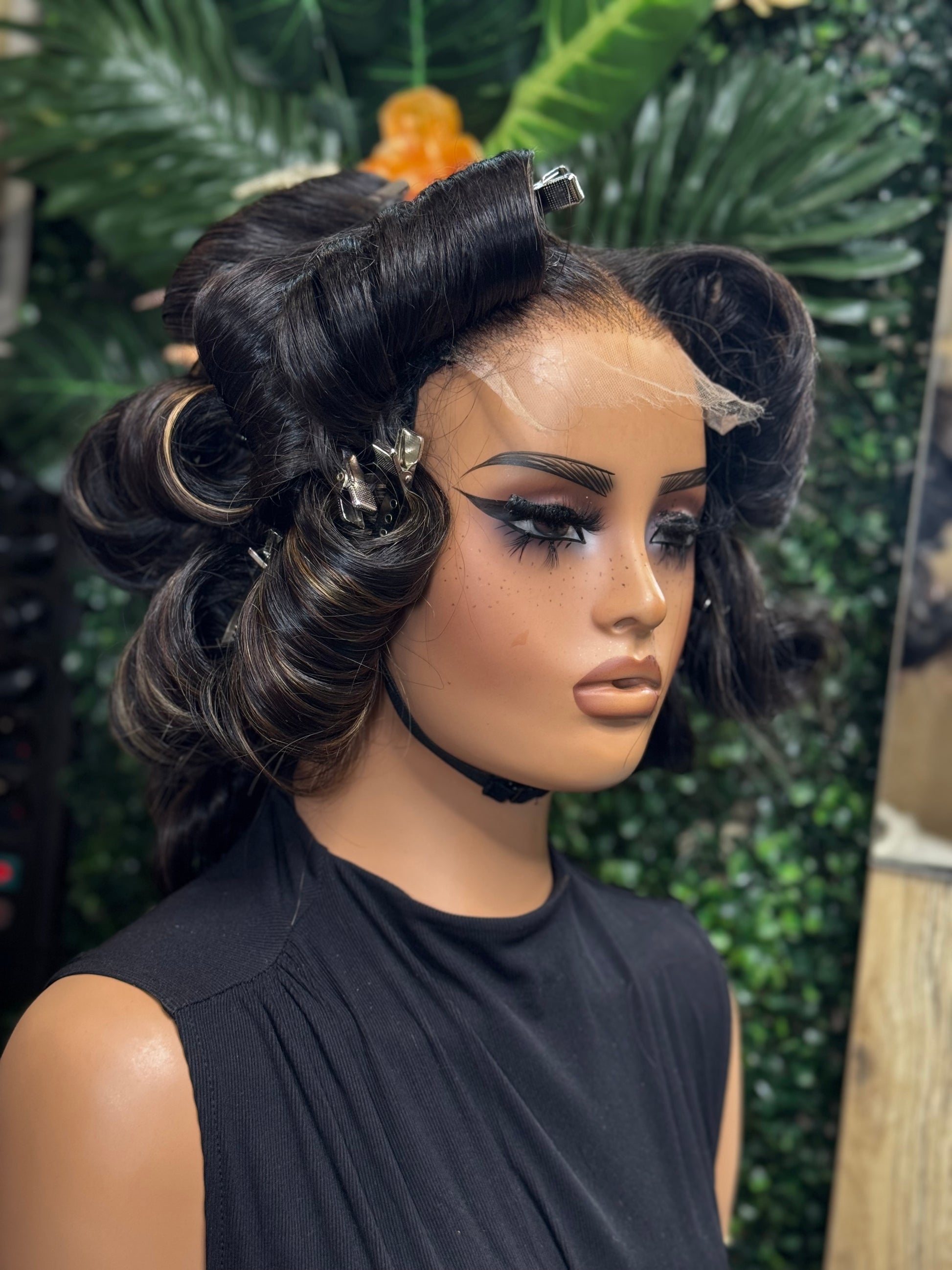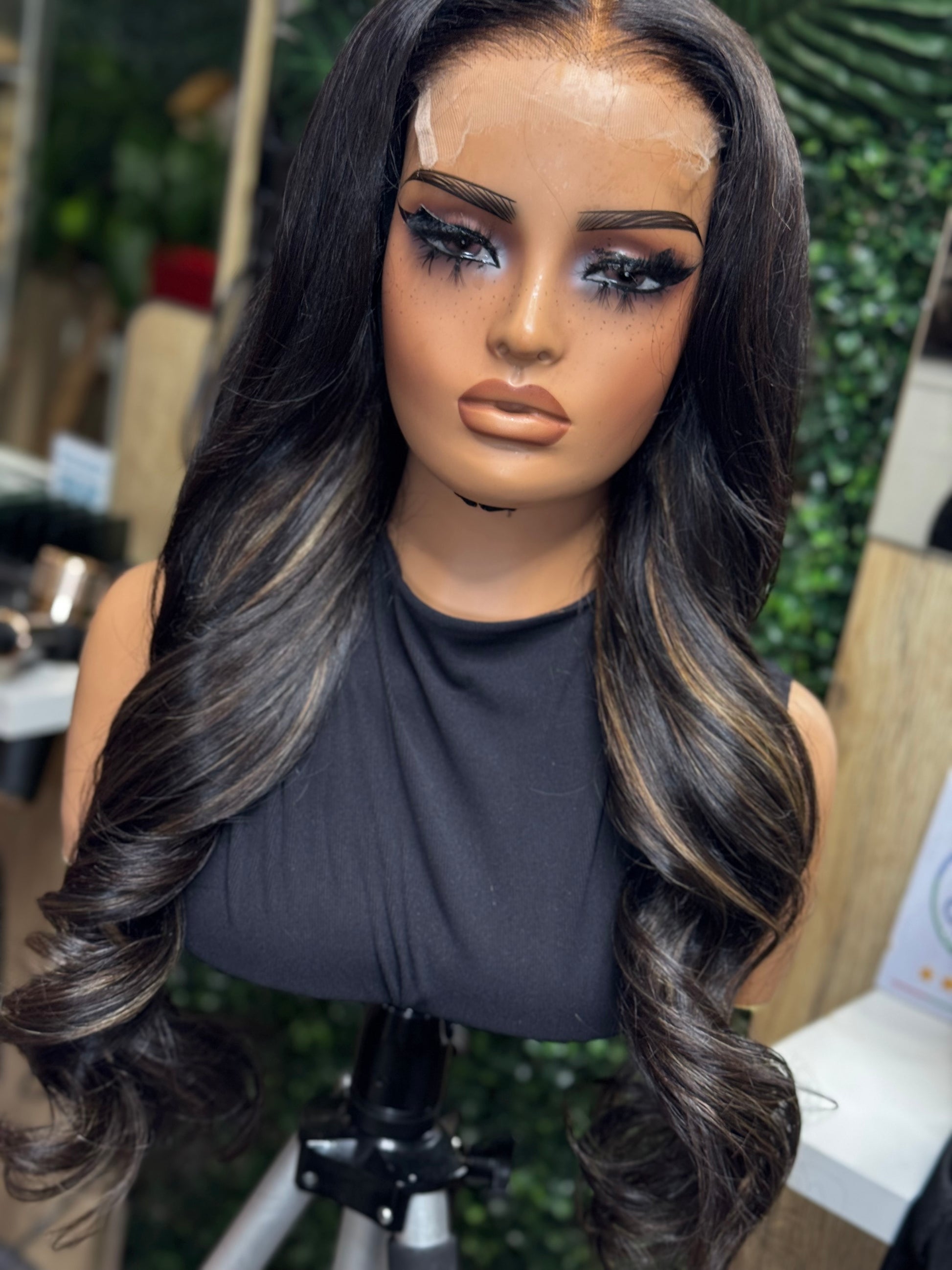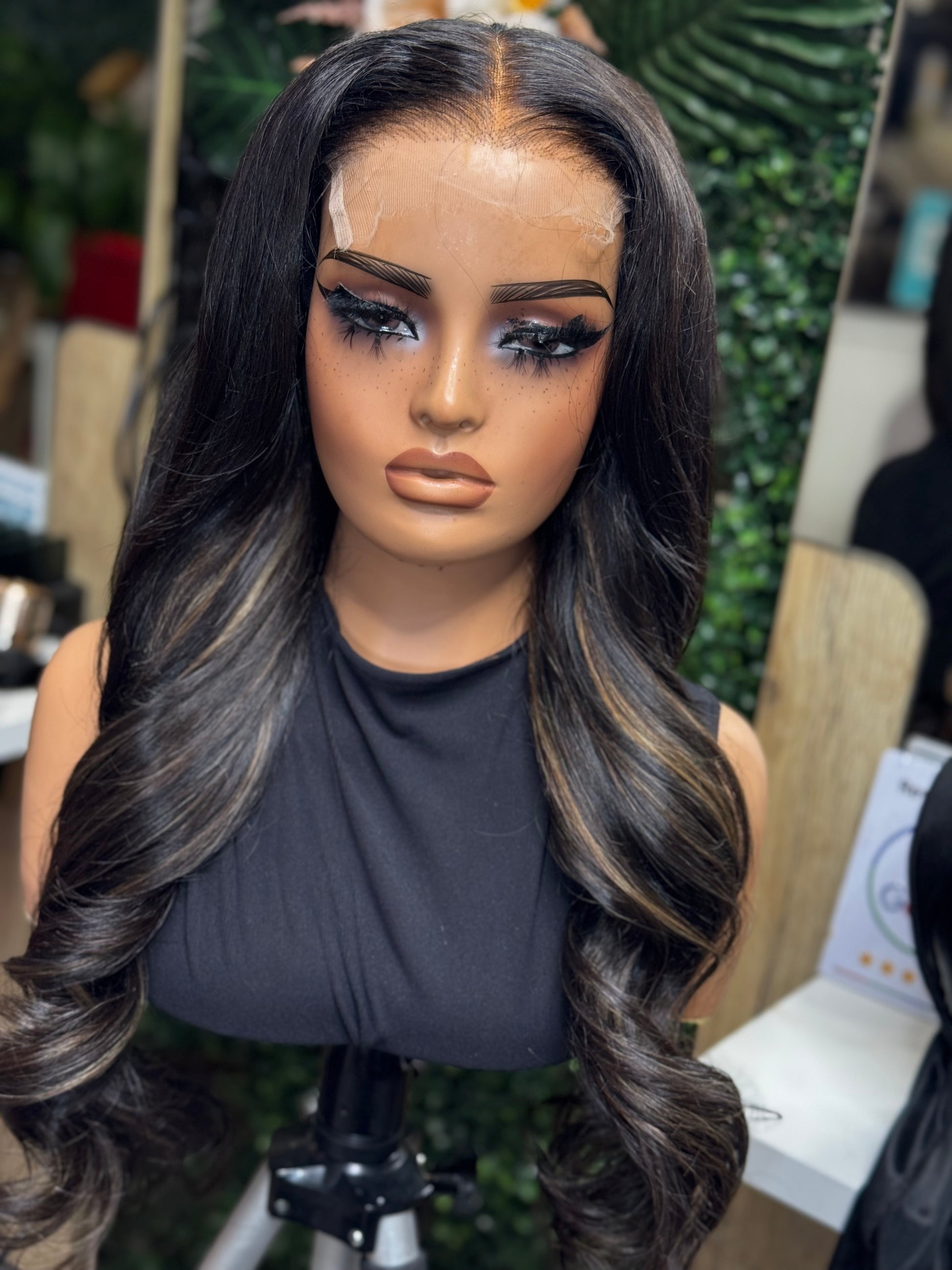 Mimi is a 26-inches , customized, hand-stitched wig made with premium raw Indian hair and our pre colored bundles to achieve the Faux Highlights look
