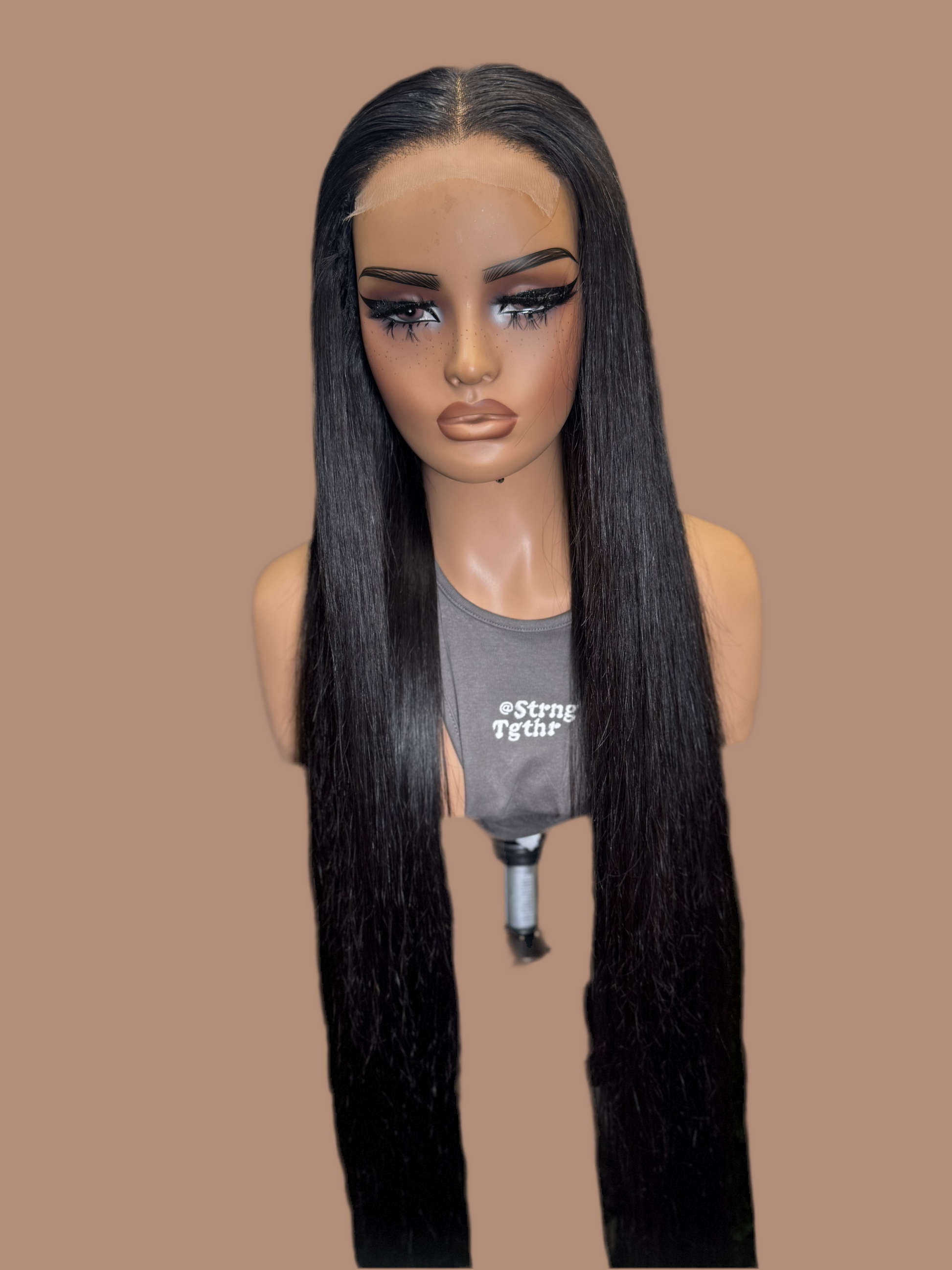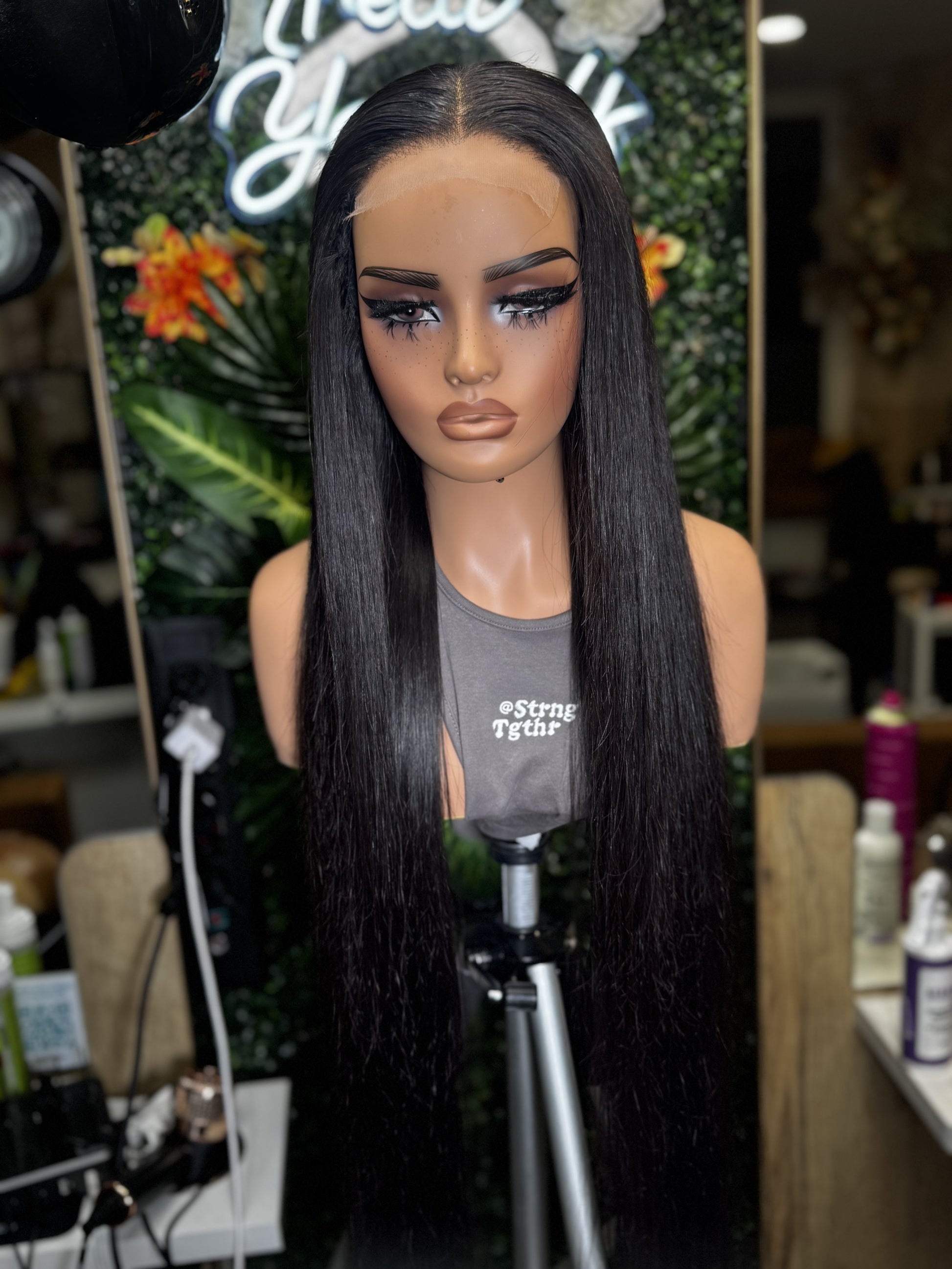 Handgenähte Sonderanfertigung aus Naturhaar mit 5x5 HD-Verschluss und 4 Bündeln à 40 Zoll. Das Haar hat die Farbe Naturschwarz.